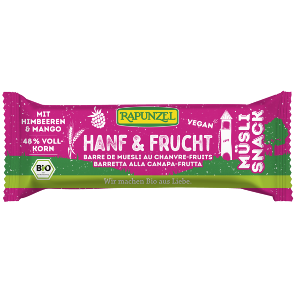 Muesli à emporter : La barre de muesli chanvre-fruit '' ravira les amateurs de fruits avec des cérales complètes en flocons et de délicates graines de chanvre accompagnées de délicieux morceaux de mangues et de framboises. Les barres de muesli sont légèrement sucrées grâce à une combinaison équilibrée de sirop de riz et de sirop d'érable.''