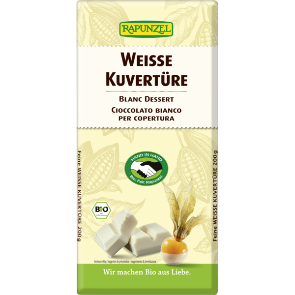 Que seraient les pralinés, les fruits sucrés ou les gâteaux sans ce glaçage fondant? L'arôme merveilleux du beurre de cacao, le lait entier et la touche de vanille Bourbon sublimeront vos gâteaux, pâtisseries et pralinés. Le cacao et le sucre sont issus du programme HAND IN HAND de Rapunzel qui allie écologie et commerce équitable.