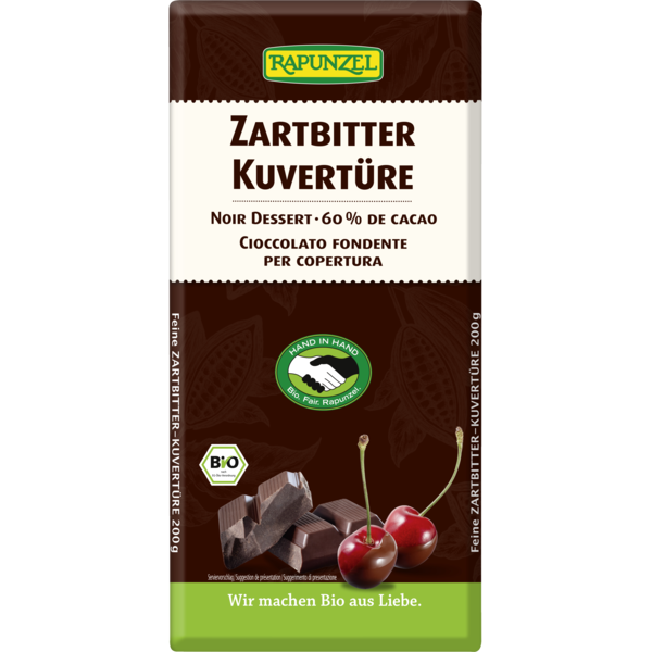 Que seraient les tendres pralinés, les fruits sucrés ou les gâteaux sans un glaçage fondant en chocolat ? La teneur élevée en cacao parfumé et corsé alliée à une note de vanille Bourbon sublimera vos gâteaux, pâtisseries et pralinés. Le cacao et le sucre sont issus du programme HAND IN HAND de Rapunzel qui allie écologie et commerce équitable.