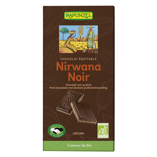 Nirwana noir - le joyau de la gamme des chocolats noirs. Fondant et onctueux, avec un subtil fourrage praliné. Le chocolat Rapunzel est synonyme de grande qualité dans le respect de la fabrication traditionnelle suisse associée à de précieux ingrédients issus de l'agriculture biologique et du commerce équitable. Avec les matières premières de qualité, le conchage intensif est le véritable secret de ce délicieux chocolat. Grâce au conchage, les riches arômes cacaotés se libèrent petit à petit jusqu'à leur plein épanouissement. Et toute la subtilité et le fondant incomparable du chocolat se dévoilent.