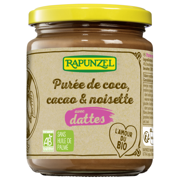 Rapunzel dispose d'un savoir-faire de presque 50 ans pour l'élaboration des purées de fruits à coque. Tout l'arôme des noisettes est libéré grâce à une torréfaction douce à air chaud. Elles sont ensuite finement moulues avec la noix de coco, le cacao et les dattes. Une production soignée vous garantit ce goût unique.