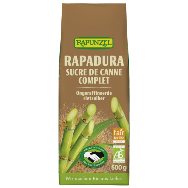 Le sucre de canne complet Rapadura est caractérisé par son goût agréable légèrement caramélisé et malté et par sa couleur brun foncé. Sa saveur si particulière est parfaite pour sucrer les desserts, la pâtisserie et les boissons. Ce sucre de canne complet est obtenu à partir du pur jus de canne à sucre. Il est fabriqué selon des méthodes traditionnelles et n'est pas raffiné. Cela permet de conserver la teneur totale en mélasse de la canne à sucre. Le sucre de canne complet Rapadura est issu du commerce équitable et fourni par les partenaires HAND IN HAND de Rapunzel.