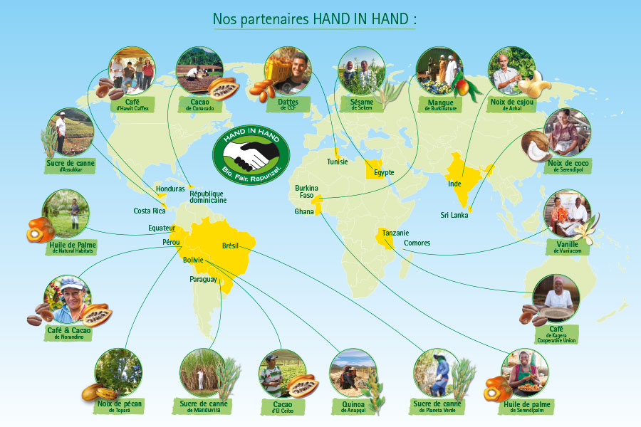 , interne à Rapunzel, figure sur l’étiquette de tous les produits Rapunzel qui contiennent au minimum 50% d’ingrédients issus de partenaires HAND IN HAND, donc certifiés commerce équitable. A ce jour plus de 130 produits Rapunzel portent le logo HAND IN HAND. Le travail en commun dans une confiance mutuelle sur le long terme, les échanges permanents tout comme les visites personnelles garantissent la grande qualité des produits. Des inspecteurs indépendants garantissent également cette qualité par des contrôles réguliers.